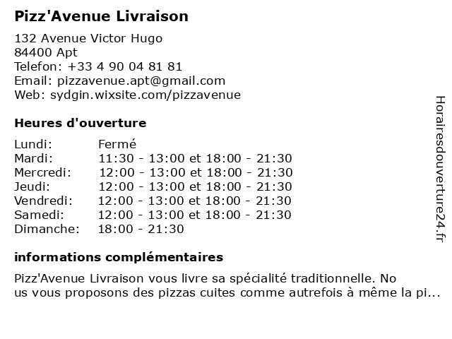 | Samedi | 12:00-13:00 et 18:00-21:30 |
