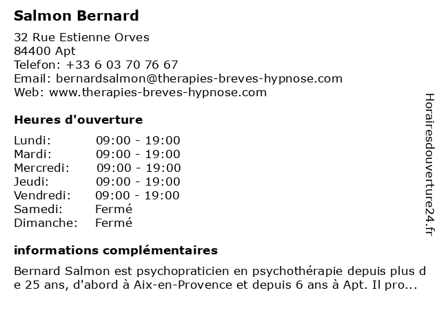 1 Bernard Philibert (Distance: 2,29 km) 28 Traverse de Roumanille, 84400 Apt bernard, chantiers, construction, magasin, matériaux, philibert, travaux 2 Bernard Philibert (Distance: 19,74 km) - Rue Gutemberg, 13640 La Roque d'Antheron bernard, bricolage, materiaux, philibert 4 Cabinet Médical du Docteur Salmon - Médecine générale (secrétariat ) (Distance: 47,82 km) 51 Rue Universelle, 84000 Avignon cabinet, consultation, docteur, du, générale, médecine, médical, salmon, santé, secrétariat 5 Dr Thierry Salmon - Psychologue (Distance: 51,36 km) 1005 Avenue Jean Monnet, 13127 Vitrolles dr, folie, psychiatre, psychiatrie, psychiatrique, psychologue, salmon, thierry 6 Castelain Bernard (Distance: 20,41 km) 28 Lotissement Quai des Entreprises, 84660 Maubec bernard, castelain |