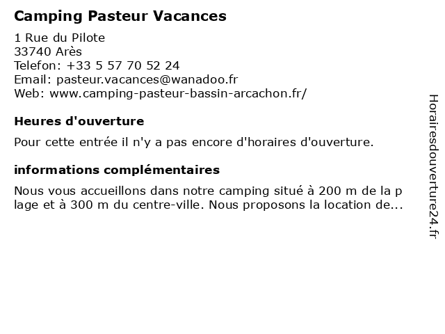 1 Camping Les Écureuils - Basse saison (Distance: 0,97 km) 1 rue des Oyats, 33740 Arès accueil, basse, camping, en, les, loisirs, saison, tourisme, vacances, Écureuils 2 Camping Les Écureuils - Moyenne saison (Distance: 0,97 km) 1 rue des Oyats, 33740 Arès accueil, camping, en, les, loisirs, moyenne, saison, tourisme, vacances, Écureuils 3 Camping Les Écureuils - Haute saison (Distance: 0,97 km) 1 rue des Oyats, 33740 Arès accueil, camping, en, haute, les, loisirs, saison, tourisme, vacances, Écureuils 4 Camping Les Écureuils - Bar - Juillet et Août (Distance: 0,97 km) 1 rue des Oyats, 33740 Arès août, bar, camping, commerces, en, et, juillet, les, loisirs, tourisme, vacances, Écureuils 5 Camping Les Goélands - Réception Juillet et Août (Distance: 1,30 km) 64 avenue de la Libération, 33740 Arès août, camping, et, goelands, goélands, juillet, juillet/août, les, loisirs, réception, tourisme, vacances 6 Camping Les Goélands - Réception Hors Saison (Distance: 1,30 km) 64 avenue de la Libération, 33740 Arès camping, goélands, hors, les, loisirs, réception, saison, tourisme, vacances |