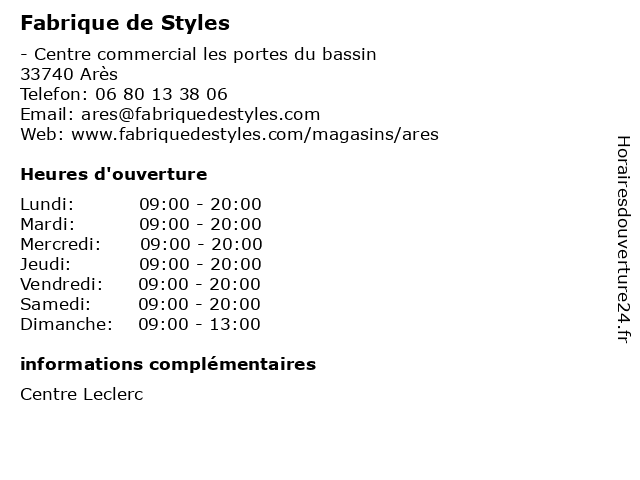 1 Fabrique de Styles (Distance: 17,52 km) 649 Avenue du Parc des Expositions, 33260 La Teste-de-Buch de, fabrique, styles 2 Ambiance & Styles (Distance: 12,79 km) . Rue Jéhènne, 33120 Arcachon ambiance, coutellerie, décoration, styles, vaisselle, verres, électroménager 3 ibis Styles Arcachon Gujan-Mestras (Distance: 17,03 km) 3 Avenue Des Loisirs, 33470 Gujan Mestras arcachon, gujan, ibis, mestras, styles 4 ibis Styles Bordeaux Saint-Médard (Distance: 34,50 km) 1 Avenue De La Boetie, 33160 St Medard En Jalles bordeaux, ibis, médard, saint, styles 5 Ambiance & Styles (Distance: 35,46 km) 34 avenue Descartes, 33160 Saint-Médard-en-Jalles ambiance, decoration, muebles, services, styles 6 |