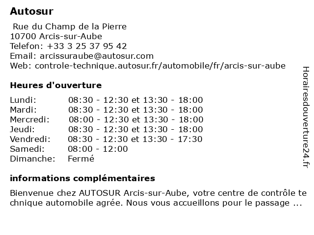 1 AUTOSUR ARCIS-SUR-AUBE (Distance: 1,05 km) chemin du champs la pierre - lieu dit "le stand", 10700 Arcis-sur-aube arcis, aube, autosur, sur 2 AUTOSUR BARBEREY-SAINT-SULPICE (Distance: 24,40 km) Rue Amédée Bollée, 10600 Barberey-Saint-Sulpice autosur, barberey, saint, sulpice 3 AUTOSUR TROYES STADE DE L'AUBE (Distance: 25,10 km) 11 Rue Fernand Doré, 10000 Troyes autosur, de, l'aube, stade, troyes 4 AUTOSUR SAINT-PARRES-AUX-TERTRES (Distance: 26,11 km) Avenue Général de Gaulle, 10410 Saint-Parres-aux-Tertres autosur, aux, parres, saint, tertres 6 AUTOSUR SAINTE-SAVINE (Distance: 28,62 km) 2 Rue Robert Schuman, 10300 Sainte-Savine autosur, sainte, savine |