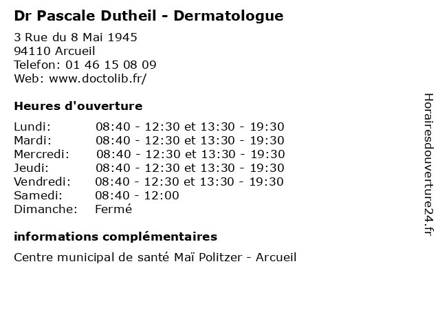 1 Dr Claude Mourier - Dermatologue (Distance: 0,00 km) 3 Rue du 8 Mai 1945, 94110 Arcueil claude, dermatologue, dr, mourier, médecin, médecine, médical, pharmaceutique, traitement 2 Dr Pascale Bobineau - Orthodontiste (Distance: 0,82 km) 20 Avenue du Président Wilson, 94230 Cachan bobineau, dent, dentiste, docteur, dr, orthodontiste, pascale, soins 3 Dr Pascale Elbaz - Dentiste (Distance: 2,34 km) 70 Rue du Père Corentin, 75014 Paris care, clinic, dentist, dentiste, dr, elbaz, france, health, pascale, service 4 Dr. Pascale Elbaz - Dentiste (Distance: 2,34 km) 70 Rue du Pere Corentin, 75014 Paris dentiste, docteur, dr., elbaz, medecins, pascale, sante 5 Medecin Beatrice Serre Kuperberg (dermatologue) (Distance: 2,35 km) 9 Place Victor Hugo, 94270 Le Kremlin-Bicêtre beatrice, dermatologue, docteur, kuperberg, medecin, sante, serre, services 6 Medecin Beatrice Serre Kuperberg (dermatologue) (Distance: 2,35 km) 9 Place Victor Hugo, 94270 Le Kremlin-Bicêtre beatrice, dermatologue, docteur, kuperberg, medecin, sante, serre, services |