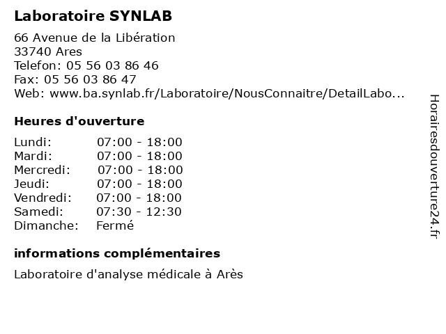 1 Laboratoire SYNLAB (Distance: 2,31 km) 157 Boulevard de la République, 33510 Andernos les Bains analyse, biologie, examenenes, laboratoire, synlab 2 Laboratoire SYNLAB (Distance: 11,65 km) 7 Boulevard Deganne, 33120 Arcachon analyse, biologie, examenenes, laboratoire, synlab 3 Laboratoire Analabo (Distance: 11,50 km) 31 allée de Boissière, 33980 Audenge analabo, biologie, de, laboratoire, medicale, services 4 Laboratoire Tournaud Et Fils SARL (Distance: 11,58 km) 27 Rue Duchenne, 33120 Arcachon et, fils, laboratoire, sarl, tournaud 5 Laboratoire Biolab33 (Distance: 13,29 km) 47 Rue Lagrua, 33260 La Teste biolab33, bureau, consultation, dr, laboratoire, maladie, med, médecin, médecine, pratique, thérapie, traitement 6 Laboratoire d'analyses médicales - Gujan-Mestras - Cerballiance (Distance: 14,09 km) 2 Allée Montaigne, 33470 Gujan-Mestras cerballiance, d'analyses, dépistages, gujan, laboratoire, mestras, médicales |