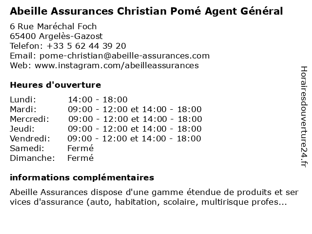 1 Abeille Assurances Christian Pomé Agent Général (Distance: 10,50 km) 7 Avenue du Maréchal Foch, 65100 Lourdes abeille, agent, assurances, christian, général, pomé 2 Areas Assurances (Distance: 0,03 km) 3 Rue du Marechal Foch, 65400 Argeles Gazost agents, areas, assurances, mathieu, santé, services, varis 5 Hôtel Christian Cluny (Distance: 10,75 km) 24 Avenue Bernadette Soubirous, 65100 Lourdes bar, christian, cluny, hotel, hôtel, restaurant, service 6 Moreau Christian (Distance: 10,83 km) 38 Rue De La Grotte, 65100 Lourdes boulangeries, christian, détail, moreau |