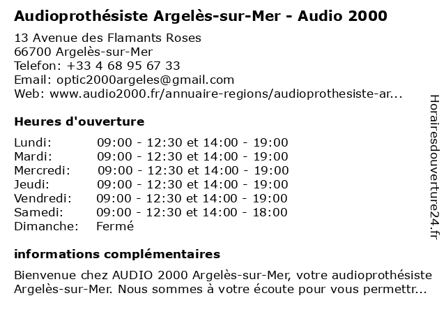 1 Audioprothésiste Argelès-sur-mer Audition Santé (Distance: 0,00 km) 11 Avenue Des Flamants Roses, 66700 Argelès-sur-mer argelès, audiologie, audioprothésiste, audition, mer, santé, sur 2 Opticien Argelès-sur-Mer - Optic 2000 - ZA de la Grône (Distance: 0,02 km) 13 Avenue des Flamants Roses, 66700 Argelès-sur-Mer 2000, argelès, de, grône, la, lentilles de contact, lunettes de soleil, lunettes de vue, mer, optic, optic2000, opticien, opticien optic2000, ray-ban, rayban, sur, za 3 Audika - Audioprothésiste Argelès-sur-Mer (Distance: 0,34 km) 7 Rue des Aigrettes, 66700 Argelès-sur-Mer appareil auditif, argelès, audika, audiologiste, audioprothésiste, centre auditif, mer, spécialiste audition, sur 4 Audioprothésiste ARGELÈS-SUR-MER Optical Center (Distance: 0,57 km) Rue des Hérons, 66700 Argelès-sur-Mer argelès, audioprothésiste, center, mer, optical, sur 5 Audioprothésiste Argelès sur Mer Alain Afflelou Acousticien (Distance: 0,57 km) Rue des Hérons, 66700 Argelès-sur-Mer acousticien, afflelou, alain, argelès, audioprothésiste, mer, sur 6 Audioprothésiste Argelès-Sur-Mer-Alain Afflelou Acousticien (Distance: 0,58 km) Centre Commercial Intermarché, 66700 Argelès-Sur-Mer acousticien, afflelou, alain, argelès, audiologie, audioprothésiste, clinique médicale, mer, sur |
