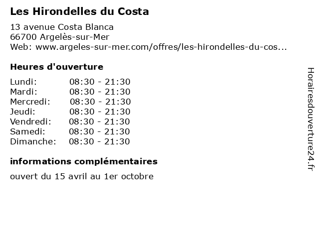 1 Laverie Costa Blanca - juillet et aôut (Distance: 0,05 km) 10 allée des Ecureuils, 66700 Argelès sur Mer aôut, blanca, costa, et, juillet, laverie, linges, pressing, repassage, service 2 Restaurant Le Costa (Distance: 0,13 km) - Boulevard de la Méditérannée, 66700 Argelès-sur-Mer bar, brasserie, café, costa, le, pizzeria, restaurant, restauration 3 La Costa (Distance: 19,19 km) 955 Avenue Julien Pancho, 66000 Perpignan bar, boite de nuit, costa, discothèque, la, soirée 4 Le Lamparo (Distance: 0,00 km) 13 Allée des Ecureuils, 66700 Argelès-sur-Mer costa, de, fruits, lamparo, le, maree, mer, plats, repas, restaurants 5 El Toro Loco (Distance: 3,16 km) El Toro Loco, 66700 Argeles Sur Mer costa, loco, maree, restaurants, toro 6 Dr Thierry Costa - Gynécologue Obstétrique (Distance: 21,93 km) 20 Avenue du Languedoc, 66046 Perpignan bebe, costa, dr, gynecologie, gynécologie, gynécologue, maternite, maternité, obstetriaue, obstétrique, thierry |
