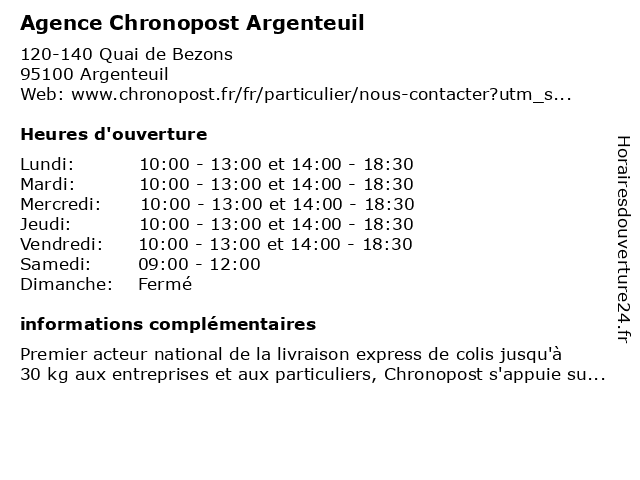 1 Agence Chronopost Cormeilles-en-Parisis (Distance: 3,90 km) 6 Allée du 7ème Art, 95240 Cormeilles-en-Parisis agence, chronopost, cormeilles, en, parisis 2 Agence Chronopost Villeneuve-la-Garenne (Distance: 5,65 km) 155 Boulevard Charles de Gaulle, 92390 Villeneuve-la-Garenne agence, chronopost, garenne, la, villeneuve 3 Chronopost (Distance: 8,02 km) 16 Rue des Belles Feuilles, 75116 Paris assurances et services, banques, chronopost 4 Chronopost (Distance: 8,67 km) 37 Rue la Boetie, 75008 Paris assurances et services, banques, chronopost 6 Chronopost (Distance: 9,03 km) 13 Rue d'Amsterdam, 75009 Paris assurances et services, banques, chronopost |