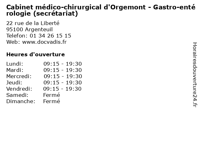 1 Dr Pierre Legallais - Gastro-entérologue et hépatologue (Distance: 0,00 km) 22 rue de la Liberté, 95100 Argenteuil consultation, docteur, dr, entérologie, entérologue, et, gastro, hépatologue, legallais, pierre, santé 2 Medecin Elvira Conti - Horaires du Cabinet (Chirurgien orthopédiste et traumatologue) (Distance: 0,00 km) 22 Rue de la Liberté, 95100 Argenteuil cabinet, chirurgien, conti, docteur, du, elvira, et, horaires, medecin, orthopédiste, sante, services, traumatologue 3 Dr Cathia Joseph-Reinette - Gastro-entérologue et hépatologue (Distance: 0,43 km) 21 Rue Defresne-Bast,, 95100 Argenteuil cathia, dr, entérologue, et, gastro, hépatologue, joseph, médecin, médecine, médical, pharmaceutique, reinette, traitement 4 Cabinet infirmier Diaite Khady (Distance: 0,61 km) 2 Boulevard Léon Feix, 95100 Argenteuil cabinet, diaite, infirmier, khady 5 Centre médico-dentaire Allemane (Distance: 0,67 km) 6 Boulevard Jean Allemane, 95100 Argenteuil allemane, centre, dent, dentaire, dentiste, docteur, médico, soins 6 CH Argenteuil - Hépato- Gastro- Entérologie / Dr Abboura (Distance: 0,95 km) 69 Rue du Lieutenant-Colonel Prudhon, 95107 Argenteuil abboura, argenteuil, bureau, ch, consultation, dr, entérologie, gastro, hépato, maladie, med, médecin, médecine, pratique, thérapie, traitement |
