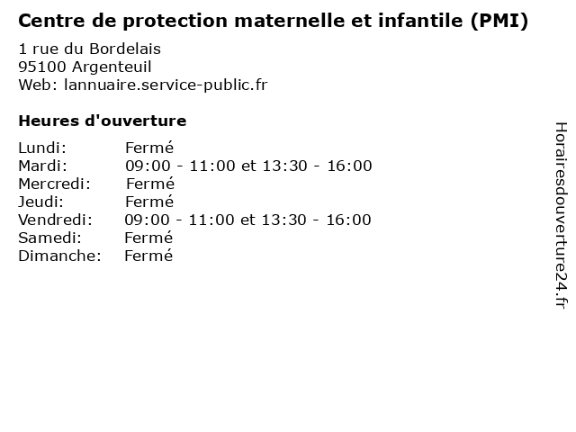 1 Centre de protection maternelle et infantile (PMI) (Distance: 1,89 km) - Allée des Louises-Bonnes, 95110 Sannois bébé, centre, de, et, infantile, maternelle, parents, pmi, protection, puéricultrice, pédiatre, vaccins 2 Centre de protection maternelle et infantile (PMI) (Distance: 2,96 km) n/a Square Georgette-Agutte, 95210 Saint-Gratien administration, assoc, associations, aux, centre, d'information, de, des, dédié, et, greffe, infantile, information, local, locale, maternelle, mission, personnes, pmi, protection 3 Centre de Protection Maternelle et Infantile (PMI) (Distance: 3,04 km) 2 Rue des Bretons, 95100 Argenteuil administration, assoc, associations, aux, centre, d'information, de, des, dédié, et, greffe, infantile, information, local, locale, maternelle, mission, personnes, pmi, protection 4 Centre de protection maternelle et infantile (PMI) (Distance: 3,57 km) 2 Place Niepce, 95240 Cormeilles en Parisis administration, assoc, associations, aux, centre, d'information, de, des, dédié, et, greffe, infantile, information, local, locale, maternelle, mission, personnes, pmi, protection 5 Centre de protection maternelle et infantile (PMI) (Distance: 4,66 km) 3 esplanade Salvador-Allende, 95100 Argenteuil administration, assoc, associations, aux, centre, d'information, de, des, dédié, et, greffe, infantile, information, local, locale, maternelle, mission, personnes, pmi, protection 6 Centre de protection maternelle et infantile (PMI) (Distance: 4,81 km) 19 Rue Victor-Hugo, 95390 Saint-Prix bébé, centre, de, et, infantile, maternelle, parents, pmi, protection, puéricultrice, pédiatre, vaccins |