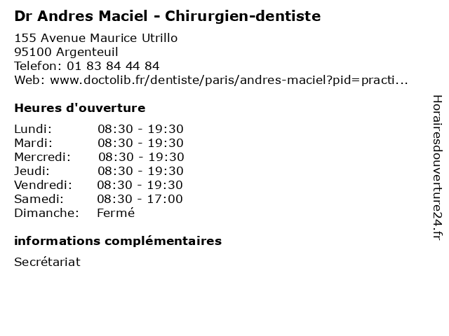 1 Dr Andres Maciel - Chirurgien-dentiste (Distance: 16,58 km) 80 Rue Nationale, 75013 Paris andres, chirurgien, dentaire, dentiste, dr, implantologie, maciel, parodontologie 2 Garzon Garcia Andres (Distance: 4,45 km) 66 Rue Georges Quiquere, 92230 Gennevilliers andres, garcia, garzon, restaurants 3 Sabine Andres - Psychologue (Distance: 5,79 km) 13 Rue Félix Faure, 92600 Asnières-sur-Seine andres, folie, psychiatre, psychiatrie, psychiatrique, psychologue, sabine 4 Maître Denis Andres - Avocat (Distance: 9,65 km) 32 Rue de Monceau, 75008 Paris andres, avocat, denis, droit, maître, négociation 5 Dr Pascal Andres - Chirurgien-dentiste (Distance: 10,58 km) 97 Rue Saint-Lazare, 75009 Paris andres, chirurgien, dentiste, dr, médecin, médecine, médical, pascal, pharmaceutique, traitement 6 Dr Pascal Andres - Chirurgien-dentiste (Distance: 10,58 km) 97 Rue Saint-Lazare, 75009 Paris andres, chirurgien, consultation, dentiste, docteur, dr, med, médecin, médecine, pascal, secrétariat, traitement |