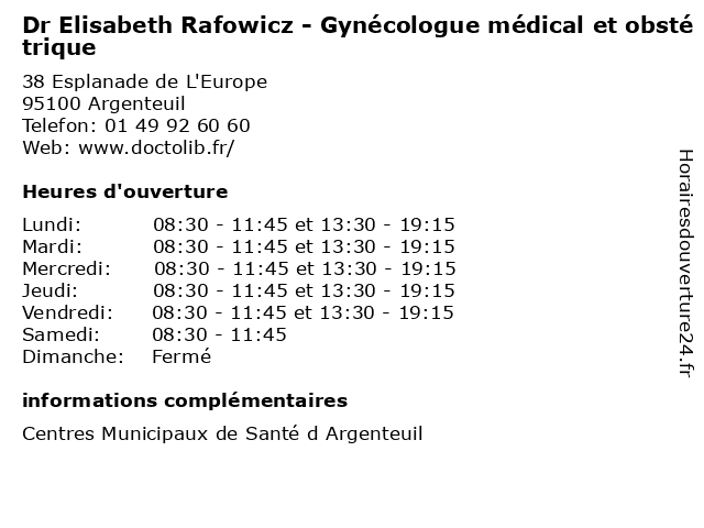 | Lundi | 08:30-11:45 et 13:30-19:15 |