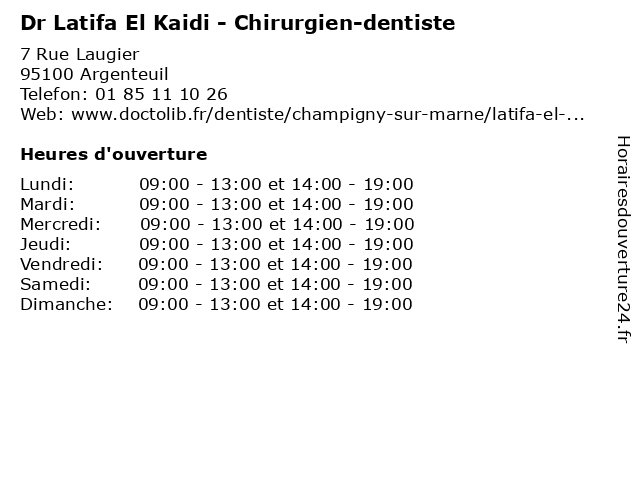 1 Dr Latifa El Kaidi - Chirurgien-dentiste (Distance: 5,09 km) 57 Rue Armand Silvestre, 92400 Courbevoie chirurgien, consultation, dentiste, docteur, dr, el, kaidi, latifa, med, médecin, traitement 2 Dr Latifa El Kaidi - Chirurgien-dentiste (Distance: 8,74 km) 85/87 Rue de Strasbourg, 93200 Saint-Denis chirurgie, chirurgien, dentaire, dentiste, dr, el, kaidi, latifa 3 Dr El Khalifa Astifate - Médecin généraliste (Distance: 0,11 km) 21 Rue Defresne-Bast,, 95100 Argenteuil astifate, dr, el, généraliste, khalifa, médecin, médecine, médical, pharmaceutique, traitement 4 Dr Mohamed El Jarrari - Radiologue (Distance: 0,11 km) 21 Rue Defresne-Bast,, 95100 Argenteuil dr, el, jarrari, mohamed, médecin, médecine, médical, pharmaceutique, radiologue, traitement 6 Sihem El Kamel - Chirurgien-dentiste (Distance: 0,47 km) 108 Rue Paul Vaillant Couturier, 95100 Argenteuil chirurgien, dent, dentiste, docteur, el, kamel, sihem, soins |