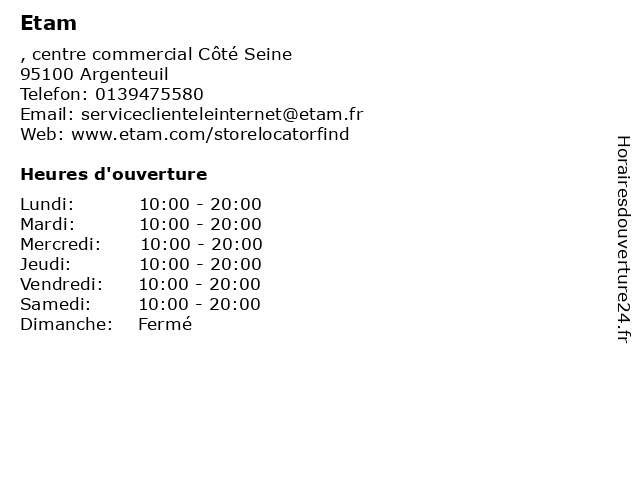 1 Etam (Distance: 0,04 km) 50 Avenue du Maréchal Foch, 95100 Argenteuil beaute, cafe, chaussures, enfants, etam, lingerie, mode femmes, mode hommes, restaurant, sport 2 Etam (Distance: 0,06 km) 50 Avenue du Maréchal Foch, 95100 Argenteuil boutiques, centre, etam, exceptionnelle, mode, ouverture, shopping 3 Etam (Distance: 3,86 km) . zac du Bois Rochefort, 95240 Cormeilles-en-Parisis accessoires, etam, habillements, lingerie, vetement 4 Etam (Distance: 4,36 km) . Bruyères, 95240 Cormeilles-En-Parisis centre, commercial, cormeilles, en, etam, parisis 5 Etam (Distance: 8,20 km) - Rue Théroigne de Méricourt, 95150 Taverny accessoires, boutique, etam, lingerie, vetement 6 Etam (Distance: 11,11 km) 101 Porte Berger, 75045 Paris chaussures, etam, lingerie, mode enfant, mode femmes, mode hemmes, sport |