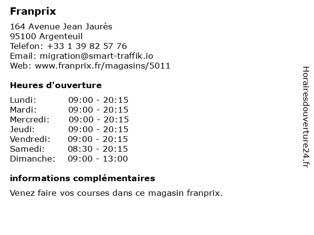 1 Franprix (Distance: 1,71 km) 76 rue Edouard Vaillant, 95870 BEZONS alimentation générale, entretien de la maison et de l'hygiène, franprix, franprix magasin, fruits et légumes frais 2 Franprix (Distance: 2,37 km) 237 Rue du Président Salvador Allende, 92700 Colombes alimentaire, alimentation, courses, franprix, supermarché, supérette, épicerie 3 Franprix (Distance: 2,49 km) 68 Boulevard de Valmy, 92700 Colombes bibi, carte de fidélité, courses, franprix, magasin, produits frais, programme de fidélité, supermarché, épicerie 4 Franprix (Distance: 2,80 km) 17 Boulevard de Finlande, 92700 Colombes bibi, carte de fidélité, courses, franprix, magasin, produits frais, programme de fidélité, supermarché, épicerie 5 Franprix (Distance: 3,12 km) 13-15 rue Saint Denis, 92700 COLOMBES alimentation générale, entretien de la maison et de l'hygiène, franprix, franprix magasin, fruits et légumes frais 6 Franprix (Distance: 4,98 km) 12 Esplanade Charles de Gaulle, 92000 Nanterre bibi, carte de fidélité, courses, franprix, magasin, produits frais, programme de fidélité, supermarché, épicerie |