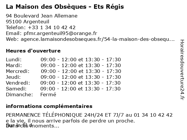 1 La Maison des Obsèques - Ets Régis (Distance: 5,58 km) 11 Rue de l'Église, 95170 Deuil-la-Barre des, ets, la, maison, obsèques, régis 2 Services Hoteliers Et Restauration Pour Les Ets De Personnes Agees Et De Soins (Distance: 3,27 km) 18 Avenue Menelotte, 92700 Colombes agees, hotelier, hoteliers, pers, personnes, rest, restaurants, restauration, sce, services, soins 3 AR Régis Fleurs (Distance: 3,81 km) 3 Avenue Salvador Allende, 93800 Épinay-sur-Seine ar, fleurs, régis 5 ETS HORTICOLE HEMON (Distance: 4,10 km) Chemin des Beurriers, 95240 Cormeilles-en-Parisis ets, hemon, horticole 6 Le Choix Funeraire Courbevoie - Ets Brulfert (Distance: 6,63 km) 2 Rue Albert Simonin, 92400 Courbevoie brulfert, choix, courbevoie, ets, funeraire, le |