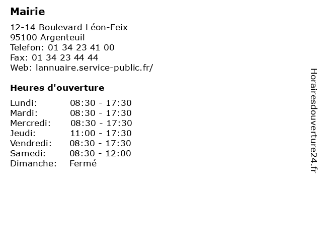 1 Mairie (Distance: 3,41 km) 7 Rue Henri Barbusse, 95210 St Gratien commune, gratien, mairie, restaurants, saint 2 Mairie (Distance: 4,77 km) 3 Avenue Maurice-Berteaux, 95240 Cormeilles-en-Parisis administration, mairie, public, service 3 5 Mairie (Distance: 6,07 km) 1 Place Henri Malou, 76940 Arelaune-en-Seine administration, mairie, public, service 6 |