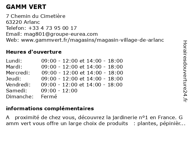 1 GAMM VERT (Distance: 13,27 km) 5 Place de la Gare, 43500 Craponne-sur-Arzon alimentation animale, animalerie, animaux de basse-cour, arbre à chat, arbres fruitiers et arbustes de pépinière, barbecues et planchas, composteurs, croquettes pour chiens, désherbage, engrais bio, gamm, graines, litière pour chats, mobilier de jardin, outils de jardin, plantes, poissons, produits du terroir, rosiers, récupérateurs d'eau de pluie, salons de jardin et parasols, vert 2 GAMM VERT (Distance: 13,99 km) 10 BIS Rue de la Masse, 63600 Ambert alimentation animale, animalerie, animaux de basse-cour, arbre à chat, arbres fruitiers et arbustes de pépinière, barbecues et planchas, composteurs, croquettes pour chiens, désherbage, engrais bio, gamm, graines, litière pour chats, mobilier de jardin, outils de jardin, plantes, poissons, produits du terroir, rosiers, récupérateurs d'eau de pluie, salons de jardin et parasols, vert 3 GAMM VERT (Distance: 18,95 km) 19 Rue des Beates, 43500 Saint-Pal-de-Chalencon alimentation animale, animalerie, animaux de basse-cour, arbre à chat, arbres fruitiers et arbustes de pépinière, barbecues et planchas, composteurs, croquettes pour chiens, désherbage, engrais bio, gamm, graines, litière pour chats, mobilier de jardin, outils de jardin, plantes, poissons, produits du terroir, rosiers, récupérateurs d'eau de pluie, salons de jardin et parasols, vert 4 GAMM VERT VILLAGE ARLANC (Distance: 0,03 km) 7 Chemin du Cimetière, 63220 Arlanc arlanc, gamm, vert, village 5 GAMM VERT VILLAGE CRAPONNE SUR ARZON (Distance: 13,29 km) 5 Place de la Gare, 43500 Craponne-sur-Arzon arzon, craponne, gamm, sur, vert, village 6 |