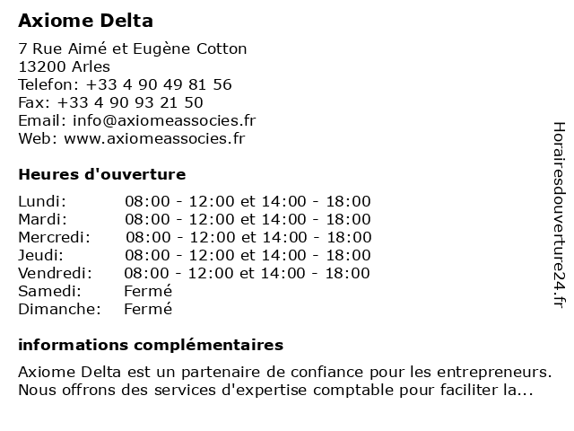 | 1 Serrurerie Ferronnerie Du Delta (Distance: 3,17 km) 18 Chemin du Trou de Fourques, 13200 Arles delta, du, ferronnerie, serrurerie 2 Delta Clean Services - Nettoyage à Arles (Distance: 3,93 km) 10 bis Rue Fernand Moutet Gimeaux, 13200 Arles arles, clean, delta, nettoyage, services 3 Axiome Delta Provence (Distance: 11,07 km) 23 lotissement Clos Saint-Antoine, 13150 Tarascon axiome, commissariat aux comptes, delta, expertise comptable, provence 4 Jetset Voyages / Delta Evasion (Distance: 11,56 km) 9 Quai Général de Gaulle, 30300 Beaucaire agence, billet d'avion et hôtel pour votre club, delta, evasion, jetset, séjour, voyages 5 Selectour - Delta Evasion (Distance: 11,56 km) 9 Quai Général de Gaulle, 30300 Beaucaire billets de train, delta, evasion, selectour, séjours, vols, voyage 6 Agence du Delta (Distance: 15,68 km) 17 avenue de la République, 13310 Saint-Martin de Crau agence, appartement, delta, du, gestion, immobilier, location, maison, transaction, vente |