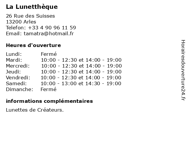 | Samedi | 10:00-13:00 et 14:30-19:00 |