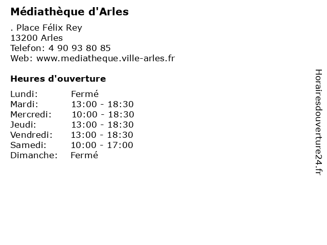 1 Médiathèque d'Arles (Ete Juillet-Aout) (Distance: 0,00 km) . Place Félix Rey, 13200 Arles aout, bibliothèque, d'arles, ete, juillet, livre, médiathèque, services 2 Médiathèque Emile Cazelles (Distance: 15,33 km) 34 avenue Emile Cazelles, 30800 Saint-Gilles cazelles, cd, dvd, emile, livres, mediatheque, médiathèque, revues 3 Bibliothèque Champfleury (Distance: 32,21 km) 2 Rue Marie Madeleine, 84000 Avignon bibliothèque, champfleury, livre, médiathèque, services 4 Médiathèque Jean-Louis Barrault (Distance: 32,29 km) 6 Rue Perrin Morel, 84000 Avignon barrault, bibliothèque, jean, livre, louis, médiathèque, services 5 Bibliothèque St Chamand (Distance: 33,40 km) . Avenue François Mauriac, 84000 Avignon bibliothèque, chamand, livre, médiathèque, services, st 6 Bibliothèque Ceccano (Adultes) (Distance: 33,41 km) 2 Rue Laboureur, 84000 Avignon adultes, bibliothèque, ceccano, livre, médiathèque, services  |