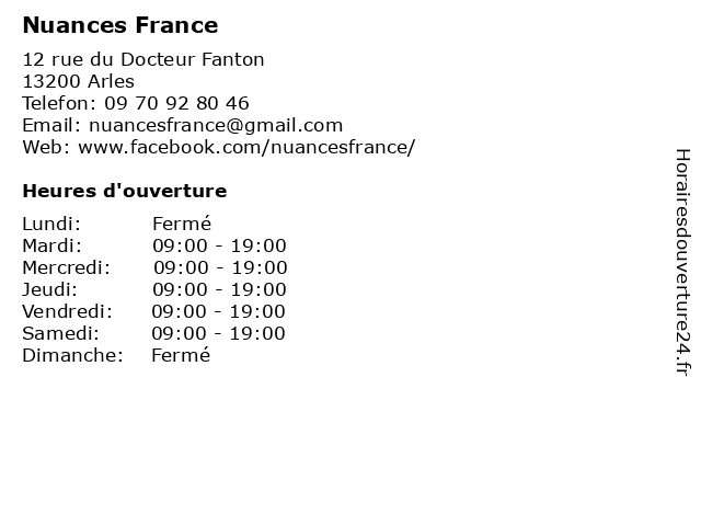 1 Nuances Traiteur 11 a 13 (Distance: 0,09 km) 11 Rue Reattu, 13200 Arles 11, 13, nuances, restaurants, traiteur 2 Nuances Unikalo Martigues (Distance: 45,52 km) 25 Avenue José Nobre, 13500 Martigues martigues, nuances, unikalo 3 NUANCES REFLETS SOCIETE GILLES TINTORINI (Distance: 48,57 km) Chemin Michel Ledrappier, 30330 Tresques gilles, nuances, reflets, societe, tintorini 4 Nuances du Sud (Distance: 58,87 km) 24 boulevard Raspail, 84190 Beaumes-de-Venise alcool, caviste, du, magasin, nuances, sud, vente 5 Sol y Sombra (Distance: 0,04 km) 5 Rue de la Place, 13200 Arles accessoires, boutique, mode, sol, sombra, tauromachie 6 Arlette Multishop (Distance: 0,04 km) 3 rue du Docteur Fanton, 13200 Arles accessoires, arlette, chaussure, chaussures, enfants, femmes, hommes, mode, multishop |