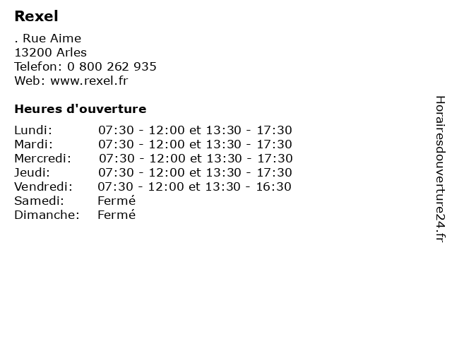 1 Rexel (Distance: 11,04 km) - Rue Aimé et Eugénie Cotton, 13200 Arles bricolage, loisirs, outillage, rexel, électrique 5 Rexel (Distance: 31,36 km) 11 Avenue du Compagnonnage, 84000 Avignon bricolage, loisirs, rexel, services 6 |