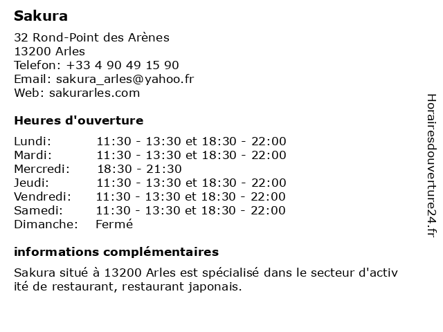 | Samedi | 11:30-13:30 et 18:30-22:00 |