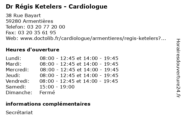 1 Dr Régis Ketelers - Cardiologue (Distance: 12,20 km) 44 Avenue Marx Dormoy, 59000 Lille cardio, cardiologie, cardiologue, coeur, dr, ketelers, régis 2 Dr Régis Ketelers - Cardiologue (Distance: 12,48 km) 11 Rue du Général de Gaulle, 59253 La Gorgue cardio, cardiologie, cardiologue, coeur, dr, ketelers, régis 3 Dr Arthur Vaksmann - Cardiologue (Distance: 0,00 km) 38 Rue Bayart, 59280 Armentières arthur, cardio, cardiologie, cardiologue, coeur, dr, vaksmann 4 Dr Olivier Henguelle - Cardiologue (Distance: 0,00 km) 38 Rue Bayart, 59280 Armentières cardio, cardiologie, cardiologue, coeur, dr, henguelle, olivier 5 Dr Fouad Rabahi - Cardiologue (Distance: 0,07 km) 27 Rue Sadi Carnot, 59280 Armentières cardiologue, dr, fouad, médecins, médicaments, rabahi, santé, secrétariat, spécialiste 6 Dr Christine Verkindere - Cardiologue (Distance: 0,36 km) - Rue Sadi Carnot, 59280 Armentières cardio, cardiologie, cardiologue, christine, coeur, dr, verkindere |