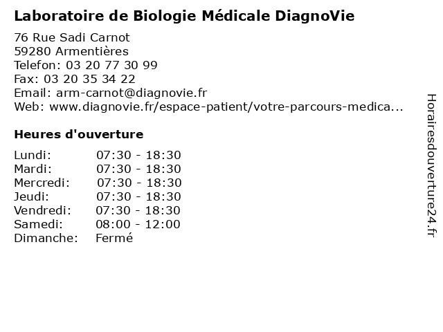 1 Laboratoire de Biologie Médicale DiagnoVie (Distance: 9,19 km) 725 avenue de Dunkerque, 59160 Lomme analyse par rayons x, biologie, de, diagnovie, détection, examenenes de laboratoire, laboratoire, lomme, médicale 2 Laboratoire Armentières Sadi Carnot - BIOGROUP NORD (Distance: 0,00 km) 76 Rue Sadi Carnot, 59280 Armentières armentières, biogroup, carnot, dépistages, laboratoire, laboratoire de diagnostic, nord, sadi 3 Dr Brigitte Chuffart - Gynécologue médicale (Distance: 0,39 km) 20 Boulevard Faidherbe, 59280 Armentières bebe, brigitte, chuffart, dr, gynecologie, gynécologue, maternite, médicale, obstetrique 4 Laboratoire Armentières Industrie - BIOGROUP NORD (Distance: 0,60 km) 7 Rue De L'industrie, 59280 Armentières armentières, biogroup, dépistages, industrie, laboratoire, laboratoire de diagnostic, nord 5 Laboratoire de La Chapelle d'Armentières - BIOGROUP NORD (Distance: 2,24 km) 315 Route Nationale, 59930 La Chapelle d'Armentières biogroup, chapelle, d'armentières, de, dépistages, la, laboratoire, laboratoire de diagnostic, nord 6 Biolille - Laboratoire d'analyses médicales (Distance: 7,09 km) 20-22 Rue Edouard Agache, 59840 Pérenchies biolille, bureau, consultation, d'analyses, dr, laboratoire, maladie, med, médecin, médecine, médicales, pratique, thérapie, traitement |