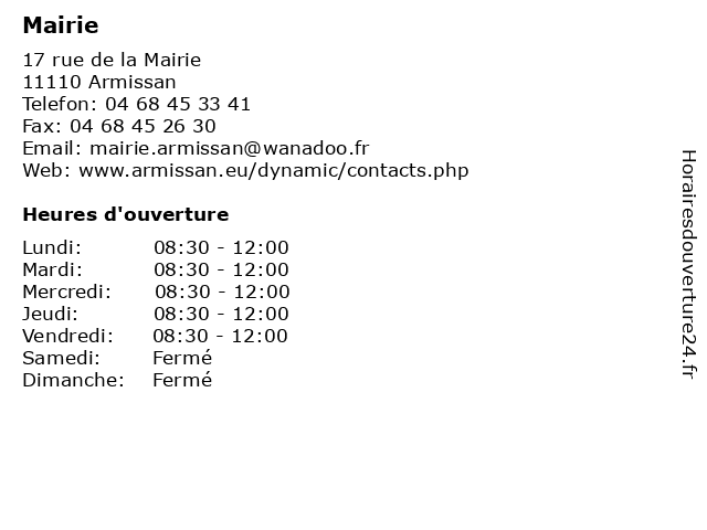1 Mairie (Distance: 6,13 km) - Place de la Mairie, 11110 Salles-d'Aude administration, mairie, public, service 2 Mairie (Distance: 6,26 km) 25 bis avenue Frédéric-Mistral, 11110 Coursan administration, mairie, public, service 3 Mairie (Distance: 8,90 km) - Boulevard Victor-Hugo, 11430 Gruissan administration, mairie, public, service 4 Mairie (Distance: 14,08 km) 2 Rue Albin-Richou, 11100 Montredon-des-Corbières administration, mairie, public, service 5 Mairie (Distance: 14,77 km) 9 avenue de Narbonne, 11120 Marcorignan administration, mairie, public, service 6 Mairie (Distance: 15,46 km) 9 Avenue Georges-Brassens, 11120 Saint-Marcel-sur-Aude administration, mairie, public, service |