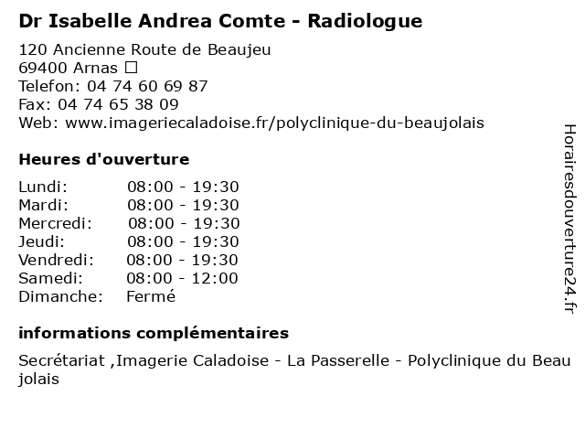 1 Dr Isabelle Andrea Comte - Radiologue (Distance: 4,78 km) 50 avenue Léon Marie Fournet, 01480 Jassans Riottier andrea, ansdrea, comte, consultation, docteur, dr, isabelle, med, médecin, médecine, radiologue, traitement 2 Dr Isabelle Andrea Comte - Radiologue (Distance: 8,29 km) - Rue du Docteur Gaudens, 69480 Anse andrea, comte, consultation, docteur, dr, isabelle, med, médecin, médecine, radiologue, traitement 3 Dr Isabelle Andrea Comte - Radiologue (Distance: 11,03 km) 32 Boulevard Joseph Rosselli, 69220 Belleville andrea, comte, consultation, docteur, dr, isabelle, med, médecin, médecine, radiologue, traitement 4 Dr Isabelle Sayegh - Gynécologue obstétricien (Distance: 1,31 km) - Plateau d'Ouilly, 69655 Villefranche-sur-Saône consultation, docteur, dr, gynécologue, isabelle, med, médecin, obstétricien, sayegh, traitement 5 Boulisset Isabelle (Distance: 2,13 km) 351 Boulevard Gambetta, 69400 Villefranche-sur-Saône boulisset, isabelle 6 Isabelle Teyssandier - Ostéopathe (Distance: 2,30 km) 174 Boulevard Gambetta, 69400 Villefranche-sur-Saône isabelle, osteo, osteopathe, ostéopathe, sante, soins, teyssandier |