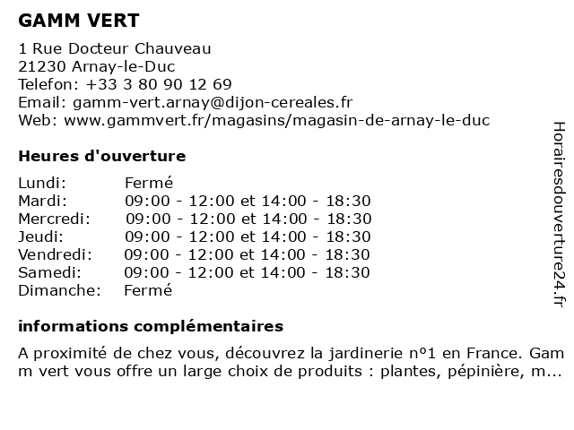 1 GAMM VERT (Distance: 13,79 km) Route d'Arnay, 21360 Bligny-sur-Ouche animalerie, gamm, jardin, jardinerie, mobilier de jardin, plantes, pépinière, vert 2 GAMM VERT (Distance: 15,91 km) 20 Rue du Sergent Stéphane Mazeau, 21320 Pouilly-en-Auxois gamm, ouverture, vert 3 Gamm vert (Distance: 17,61 km) 13BIS Avenue Mal de Lattre de Tassigny, 71360 Épinac animalerie, gamm, jardin, jardinerie, mobilier de jardin, plantes, pépinière, vert 4 Chambres d'hôtes Le Pré vert (Distance: 15,56 km) 1 Chemin Du Pasquier Martin, 21360 Crugey chambres, d'hôtes, le, pré, vert 5 Camping Vert Auxois (Distance: 15,75 km) 15 rue du Vert Auxois, 21320 Pouilly-en-Auxois auxois, camping, caravaning, mobil home, séjour, tourisme, vacances, vert 6 Gamm vert (Du 1er Mars au 31 octobre) (Distance: 22,40 km) . ST PANTALEON, 71400 AUTUN 1er, 31, animalerie, animaux, au, du, gamm, horticulteur, jardin, jardinerie, mars, octobre, vert |
