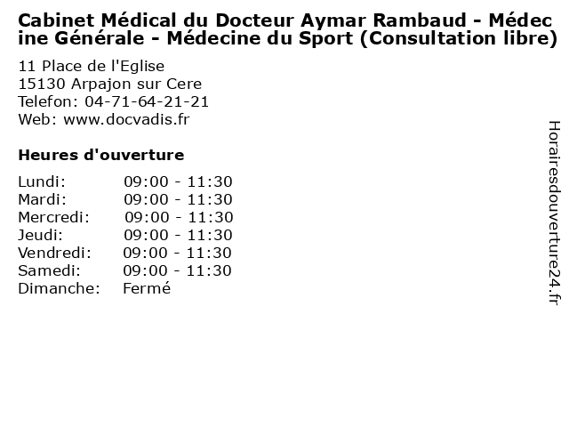 1 Cabinet Médical du Docteur Aymar Rambaud - Médecine Générale - Médecine du Sport (Consultation sur rendez-vous) (Distance: nan km) 11 Place de l'Eglise, 15130 Arpajon sur Cere aymar, cabinet, consultation, docteur, du, générale, médecine, médical, rambaud, rendez, santé, sport, sur, vous 2 Cabinet Médical du Docteur Aymar Rambaud - Médecine Générale - Médecine du Sport (secrétariat ) (Distance: nan km) 11 Place de l'Eglise, 15130 Arpajon sur Cere aymar, cabinet, consultation, docteur, du, générale, médecine, médical, rambaud, santé, secrétariat, sport 3 Dr Christian Vabre - Spécialiste en médecine physique et de réadaptation (Distance: 2,75 km) 83 Avenue Charles de Gaulle, 15000 Aurillac christian, consultation, de, docteur, dr, en, et, med, médecin, médecine, physique, réadaptation, spécialiste, traitement, vabre 5 Cabinet médical - Médecine générale (secrétariat ) (Distance: 2,83 km) 25 avenue Aristide Briand, 15000 Aurillac cabinet, consultation, docteur, générale, médecine, médical, santé, secrétariat 6 Entreprise Générale Ryamond Raynal (Distance: 3,02 km) 16 Rue de la Gare, 15000 Aurillac entreprise, générale, raynal, ryamond |
