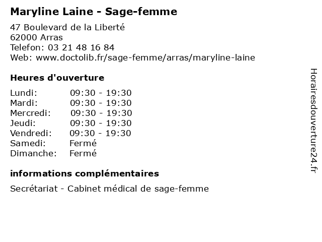 2 Dr Isabelle Hay-Laine - Médecin généraliste (Distance: 2,14 km) 6 Rue de la Symphorine, 62000 Arras consultation, docteur, dr, généraliste, hay, isabelle, laine, med, médecin, traitement 3 Pharmacie Laine (Distance: 3,81 km) 2 Rue Pasteur, 62000 Dainville homéopathie, laine, médicaments, orthopédie, parapharmacie, pharmacie 4 Dr Cédric Laine - Médecin généraliste (Distance: 5,25 km) 41 Rue d'Athies, 62223 Feuchy cedric, consultation, cédric, docteur, dr, générale, généraliste, laine, médecin, médecine, santé 5 Maryline Dulinski - Psychanalyste (Distance: 16,92 km) 7 Rue Fusillés, 62420 Billy-Montigny dulinski, folie, maryline, psychanalyste, psychiatre, psychiatrie, psychiatrique 6 Chez Maryline & Denis (Distance: 18,86 km) 54 Rue Charles Debarge, 62440 Harnes boucheries, chez, denis, dernoncourt, maryline, poissonneries |