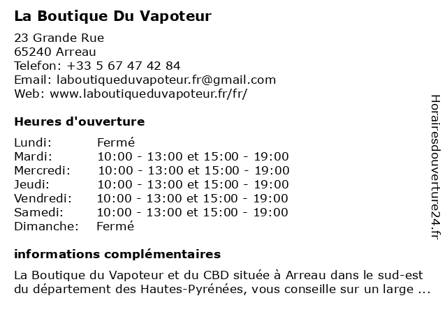 1 La Boutique du Vapoteur (Distance: 24,62 km) 24 rue Alsace Lorraine, 65300 Lannemezan boutique, du, e-cigarette, la, liquide, vapoteur, électronique 2 La Boutique du Vapoteur (Distance: 37,47 km) 17 rue du Moulat, 31800 Saint-Gaudens boutique, du, e-cigarette, la, liquide, tabac, vapoteur, électronique 3 La Boutique du Vapoteur (Distance: 39,33 km) 23 rue de la Grotte, 65100 Lourdes boutique, du, e-cigarette, la, liquide, vapoteur, électronique 4 Vapotime (Distance: 40,27 km) 10 Avenue du Cagire, 31800 Estancarbon cigarette, cigarettes, cigaverte, e-liquide, electronique, electroniques, vape, vapote, vapoteur, vapotime 5 La Boutique du Vapoteur (Distance: 42,83 km) 5 rue François Mousis, 65000 Tarbes boutique, du, e-cigarette, la, liquide, vapoteur, électronique 6 Royalcig (Distance: 43,45 km) 12 rue Massey, 65000 Tarbes cigarette, cigarettes, cigaverte, e-liquide, electronique, electroniques, royalcig, royalcigs, vape, vapote, vapoteur |