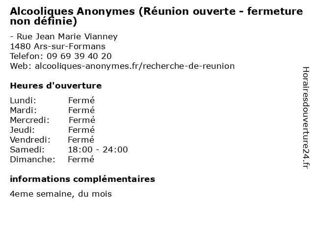 Termes de recherche pour Alcooliques Anonymes (Réunion ouverte - fermeture non définie):reunion, non, fermeture, ouverte, alcooliques, anonymes, définie, fermée |