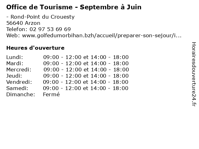 1 Office de Tourisme - Septembre à Juin (Distance: 9,44 km) - Rue Père Marie Joseph Coudrin, 56370 Sarzeau au, de, du, horaires des musées, juin, office, restaurants, septembre, tourisme, transports 2 Office de Tourisme - 1er Juillet au 31 août (Distance: 0,00 km) - Rond-Point du Crouesty, 56640 Arzon 1er, 31, août, au, de, et, horaires des musées, juillet, office, restaurants, tourisme, transports 3 Office de Tourisme - Avril à Juin & Septembre (Distance: 6,63 km) - Rue Saint-Goustan, 56730 Saint-Gildas-de-Rhuys avril, de, horaires des musées, juin, office, restaurants, septembre, tourisme, transports 4 Office de Tourisme - Avril à Septembre (Distance: 6,67 km) - Rue Benoni Praud, 56780 Île-aux-Moines avril, de, horaires des musées, office, restaurants, septembre, tourisme, transports 5 Office de Tourisme - Juillet et Août (Distance: 6,67 km) - Rue Benoni Praud, 56780 Île-aux-Moines août, de, et, horaires des musées, juillet, office, restaurants, tourisme, transports 6 Camping Penn Mar - Réception Avril à Septembre (Distance: 6,87 km) 21 route de Port Blanc, 56870 Baden au, avril, camping, campéole, caravaning, du, mar, mobil home, penn, réception, septembre, tourisme |