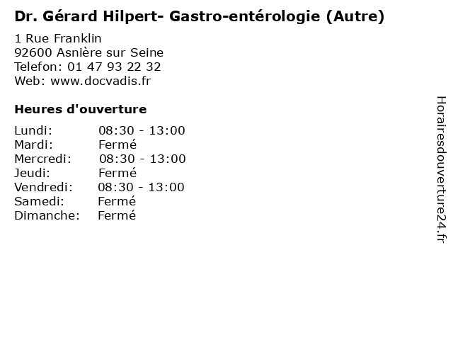 1 Dr. Gérard Hilpert- Gastro-entérologie (Consultation sur rendez-vous) (Distance: 0,00 km) 1 Rue Franklin, 92600 Asnière sur Seine consultation, docteur, dr., entérologie, gastro, gérard, hilpert, rendez, santé, sur, vous 2 Dr. Juan Amaris - Gastro-entérologie (Distance: 4,69 km) 34 Avenue d'Eylau, 75116 Paris amaris, consultation, docteur, dr., entérologie, gastro, juan, medecins, santé 3 Dr. Boukersi - Gastro-Enterologie (Distance: 6,81 km) 17-19 Avenue de Flandre, 75954 Paris boukersi, docteur, dr., enterologie, gastro, medecins, sante 4 Dr. Carlier - Gastro-Enterologie (Distance: 6,81 km) 17-19 Avenue de Flandre, 75954 Paris carlier, docteur, dr., enterologie, gastro, medecins, sante 5 Dr. Lalaude - Gastro-Enterologie (Distance: 6,81 km) 17-19 Avenue de Flandre, 75954 Paris docteur, dr., enterologie, gastro, lalaude, medecins, sante 6 Dr Carlier- Gastro-entérologie (Distance: 6,81 km) 17-19 Avenue de Flandre, 75954 Paris carlier, consultation, docteur, dr, entérologie, gastro, santé |