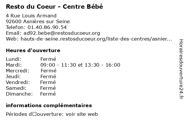 1 Resto du Coeur - Centre adultes (Distance: 0,00 km) 4 Rue Louis Armand, 92600 Asnières sur Seine adultes, adultes", aide, centre, coeur, coeur"centre, dons, du, resto, solidarité, vente 2 Les Restos Du Coeur"Centre adultes" (Distance: 0,00 km) 4 Rue Louis Armand, 92600 Asnières sur Seine adultes", aide, coeur"centre, dons, du, les, resto, restos, solidarité, vente 3 Les Resto Du Coeur"Centre bébé" (Distance: 0,12 km) 4 Rue Louis Armand, 92600 Asnières sur Seine aide, bébé", coeur"centre, dons, du, les, resto, solidarité, vente 4 Autour de Bébé (Distance: 4,90 km) 12 rue Baudin, 92400 Courbevoie autour, bébé, de, ecoutes bébé, mode, sommeil, voyage 5 Les Resto Du Coeur (Distance: 5,06 km) 41 Boulevard Anatole France, 93300 Aubervilliers aide, coeur, dons, du, les, resto, solidarité, vente 6 Crèche People and Baby - Bébé Bulles (Distance: 5,40 km) 31 Rue Jean Borderel, 95100 Argenteuil and, baby, bulles, bébé, crèche, crèches, garde d'enfants, les services parentalité, people, projet social, projet éducatif |