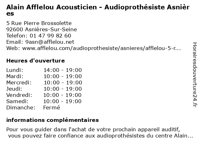 1 Opticien Asnières-Sur-Seine | Alain Afflelou (Distance: 0,00 km) 5 Rue Pierre Brossolette, 92600 Asnières-Sur-Seine afflelou, alain, asnières, magasin de lunettes de soleil, magasin d’accessoires de mode, opticien, optométrie, seine, sur 2 Amplifon Audioprothésiste Asnières-sur-Seine (Distance: 0,03 km) 1 Rue Pierre Brossolette, 92600 Asnières-sur-Seine amplifon, asnières, audiologie, audioprothésiste, seine, sur 3 Dr. Alain Clairet -Dentiste (Distance: 0,67 km) 2 Quai Aulagnier, 92600 Asnieres sur Seine alain, clairet, consultation, dentiste, docteur, dr., santé 4 Medecin Alain Struk (Angiologue) (Distance: 1,52 km) 6 Allee Auguste Renoir, 92300 Levallois-Perret alain, angiologue, docteur, medecin, sante, services, struk 5 Opticien Levallois-Perret | Alain Afflelou (Distance: 2,04 km) 54 Rue Du Président Wilson, 92300 Levallois-Perret afflelou, alain, levallois, magasin de lunettes de soleil, magasin d’accessoires de mode, opticien, optométrie, perret 6 Dr Alain Samoun - Médecin généraliste (Distance: 2,76 km) 121 Boulevard Bineau, 75013 Neuilly-sur-Seine alain, dr, généraliste, médecin, médecine, médical, pharmaceutique, samoun, traitement |