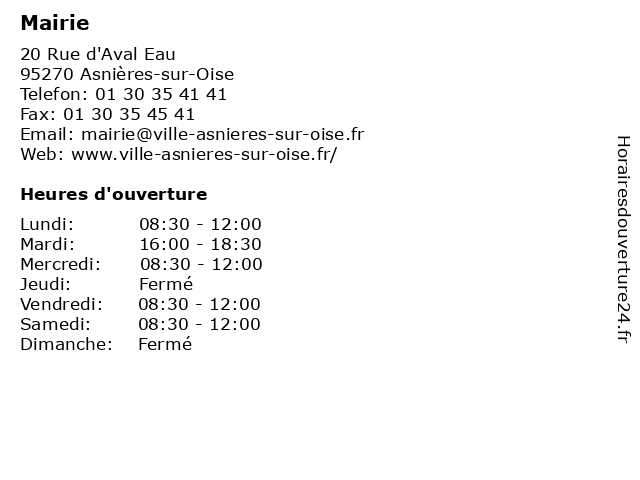 | 1 Mairie (Distance: 4,99 km) - Place de la Mairie, 95340 Bernes-sur-Oise administration, mairie, public, service 3 Mairie (Distance: 9,19 km) - Place Du General De Gaulle, 95660 Champagne Sur Oise administration, mairie, public, service 4 5 Mairie (Distance: 9,79 km) - Place de la Mairie, 95720 Le Mesnil Aubry administration, mairie, public, service 6 Mairie (Distance: 10,50 km) 10 Rue de l'Église, 95190 Châtenay-en-France administration, mairie, public, service |