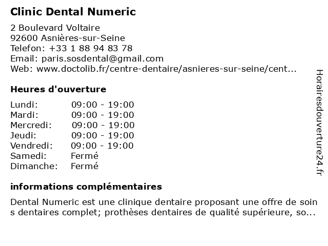 1 The Clinic - Greffe de Cheveux (Distance: 3,58 km) 56 avenue Wagram, 75017 Paris capillaire, cheveux, clinic, de, greffe, implant, the 2 Proxi Dental (Distance: 3,66 km) 5 Rue Darcet, 75017 Paris adjointe, conjointe, dentaire, dental, laboratoire, prothèse, proxi 3 Dental Centre Paris Saint Lazarus -Dentiste (Distance: 4,22 km) 46 Rue de Londres, 75008 Paris centre, consultation, dental, dentiste, docteur, lazarus, paris, saint, santé 4 Audi Grégoire Audi Dental Clinic (Distance: 4,32 km) 50 Avenue Foch, 75016 Paris audi, clinic, dental, dentist, grégoire 5 Dental Practice Jane Matkoski - Foch -Dentiste (Distance: 4,32 km) 50 Avenue Foch, 75016 Paris consultation, dental, dentiste, docteur, foch, jane, matkoski, practice, santé 6 Dental Santé 92 (Distance: 4,47 km) 12 Boulevard de la Mission Marchand, 92400 Courbevoie 92, dental, santé |