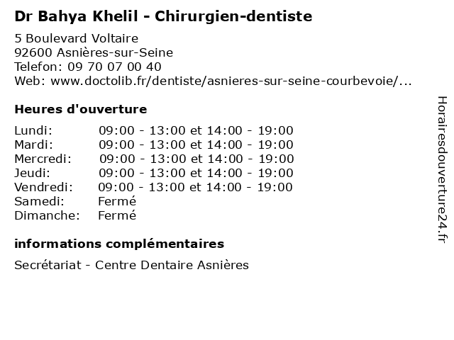 1 Dr Bahya Khelil - Chirurgien-dentiste (Distance: 8,76 km) 131 Boulevard Voltaire, 75011 Paris a'dent, bahya, centre, chirurgien, dentaire, dentiste, dr, implantologie, khelil, parodontologie 2 Dr Bahya Khelil - Chirurgien-dentiste (Distance: 9,17 km) 42 Rue de Paris, 93260 Les Lilas bahya, chirurgien, consultation, dentiste, docteur, dr, khelil, med, médecin, médecine, secrétariat, traitement 4 Maître Kawthar Ben Khelil - Avocate (Distance: 3,92 km) 2 Rue Ancelle, 92200 Neuilly-sur-Seine avocate, avocats, ben, civils, droits, juridiques, kawthar, khelil, maître 5 Dr Nacira Khelil - Médecin généraliste (Distance: 4,85 km) 97 Avenue de la République, 93800 Épinay-sur-Seine docteur, dr, generaliste, généraliste, khelil, medical, médecin, nacira, soin 6 Sarl Khelil (Distance: 7,20 km) 20 Rue Gabrielle Josserand, 93500 Pantin boucheries, khelil, poissonneries |