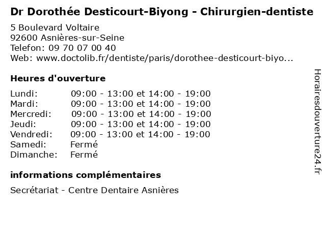 1 Dr Dorothée Desticourt-Biyong - Chirurgien-dentiste (Distance: 4,97 km) 22 Rue Myrha, 75018 Paris biyong, chirurgie, chirurgien, dentaire, dentiste, desticourt, dorothée, dr 2 Dr Dorothée Desticourt-Biyong - Chirurgien-dentiste (Distance: 7,01 km) 29 Boulevard Jules Ferry, 75011 Paris biyong, chirurgie, chirurgien, dentaire, dentiste, desticourt, dorothée, dr 3 Dorothée Demit - Sage-femme (Distance: 1,73 km) 29 Place Georges Pompidou,, 92300 Levallois-Perret demit, dorothée, femme, médecins, médicaments, sage, santé, secrétariat, spécialiste 4 Dorothée Wallut - Infirmière (Distance: 2,78 km) 9 Rue Gustave Doré, 75017 Paris consultation, docteur, dorothée, infirmière, med, médecin, traitement, wallut 5 Dorothée Dumont - Ostéopathe (Distance: 3,51 km) 123 Rue des Dames, 75017 Paris dorothée, dumont, ostéo, ostéopathe, ostéopathes, soins 6 Maître Dorothée Griveaux - Avocate (Distance: 4,09 km) 5 Boulevard Malesherbes, 75008 Paris avocat, avocate, dorothée, droit, griveaux, maître, négociation |