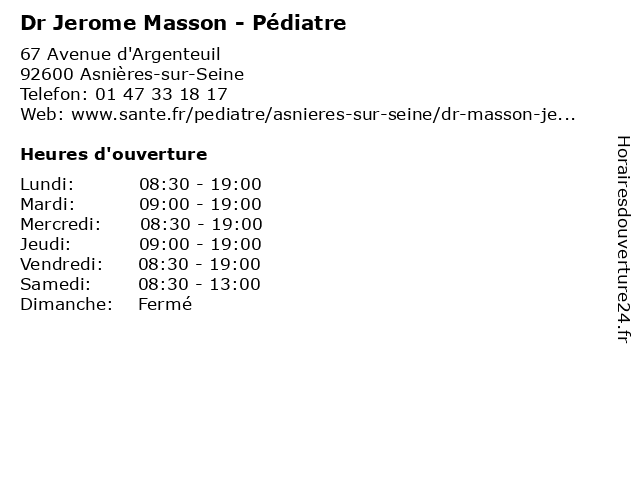 1 Dr Patricia Bourdon - Pédiatre (Distance: 0,60 km) 3 Rue Ernest Billiet, 92600 Asnières-sur-Seine bourdon, docteur, dr, generaliste, medical, patricia, pédiatre, soin 2 Dr Christine Marret Mayaud - Pédiatre (Distance: 0,68 km) 28 Rue Charles Chefson, 92270 Bois-Colombes christine, docteur, dr, generaliste, marret, mayaud, medical, pédiatre, soin 3 Dr Mathurin Selenou - Pédiatre (Distance: 1,49 km) 25 Avenue Chandon, 92230 Gennevilliers bebe, dr, mathurin, nourisson, pédiatre, pédiatrie, selenou 4 Bendahan Jerome (Distance: 1,59 km) Wilson 142 Rue Du President, 92300 Levallois Perret agents, assurance, assurances, bendahan, courtiers, jerome, services 5 Dr Lila Djaghri - Pédiatre (Distance: 1,61 km) 80 Avenue Chandon, 92230 Gennevilliers consultation, djaghri, docteur, dr, lila, med, médecin, médecine, pédiatre, traitement 6 Dr Maia Banige - Pédiatre (Distance: 1,89 km) 100 Boulevard du Général Leclerc, 92118 Clichy banige, consultation, docteur, dr, maia, med, médecin, médecine, pédiatre, traitement |