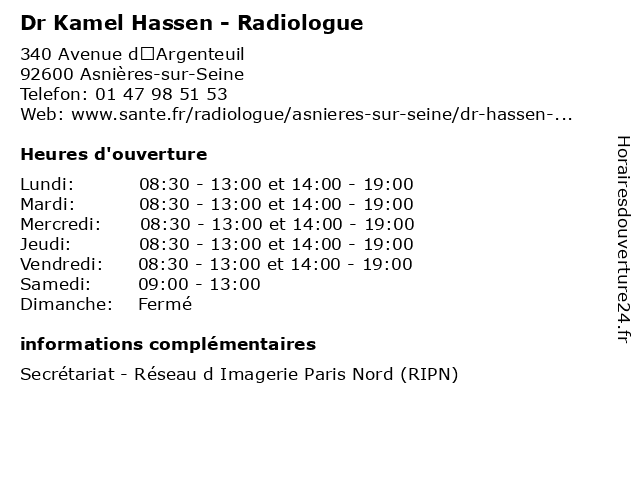1 Dr Kamel Hassen - Radiologue (Distance: 8,32 km) 83 Rue de l'Ourcq, 75019 Paris consultation, docteur, dr, hassen, kamel, med, médecin, radiologue, traitement 2 Maître Kamel Ait Hocine - Avocat (Distance: 4,78 km) 8 rue Ampère, 93200 Saint-Denis ait, avocat, avocate, avocats, civils, droits, hocine, juridiques, kamel, maître 3 Dr Hassen Adouni - Anesthésiste (Distance: 6,25 km) 9 Avenue Louis Armand, 95120 Ermont adouni, anesthésiste, consultation, docteur, dr, hassen, med, médecin, médecine, secrétariat, traitement 4 Maître Kamel Tabi - Avocat (Distance: 7,10 km) 3 Avenue Paul Doumer, 75116 Paris avocat, justice, kamel, lois, maitre, maître, tabi 5 Dr Kamel Chader - Médecin généraliste (Distance: 7,30 km) 12 Boulevard du Petit Chateau, 95600 Eaubonne chader, docteur, dr, generaliste, généraliste, kamel, medical, médecin, soin 6 Mm Meziani Said & Meziani Hassen (Distance: 7,92 km) 22 Rue Du Moutier, 93300 Aubervilliers hassen, meziani, mm, restaurants, said |