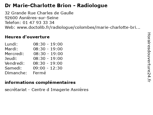 1 Dr Marie-Charlotte Brion - Radiologue (Distance: 2,32 km) 10 Rue de la Montagne, 92400 Courbevoie brion, charlotte, consultation, docteur, dr, marie, med, médecin, radiologue, traitement 2 Dr Marie-Charlotte Brion - Radiologue (Distance: 3,20 km) 63 Avenue Foch, 92250 La Garenne-Colombes brion, charlotte, docteur, dr, marie, médecin, radiologie, radiologue 3 Dr Marie-Charlotte Brion - Radiologue (Distance: 3,25 km) 94-96 Boulevard de la République, 92250 La Garenne-Colombes brion, charlotte, dr, marie, médecin, médecine, médical, pharmaceutique, radiologue, secretariat, traitement 4 Dr Marie-Charlotte Brion - Radiologue (Distance: 5,82 km) 103 Rue Edouard Vaillant, 95870 Bezons brion, charlotte, consultation, docteur, dr, marie, med, médecin, radiologue, traitement 5 Dr Marie-Charlotte Brion - Radiologue (Distance: 8,42 km) 17 Rue du Château, 92500 Rueil-Malmaison brion, charlotte, consultation, docteur, dr, marie, med, médecin, radiologue, traitement 6 Dr Marie-Charlotte Brion - Radiologue (Distance: 11,87 km) 78 Avenue du Général Leclerc, 94270 Le Kremlin-Bicêtre brion, charlotte, consultation, docteur, dr, marie, med, médecin, médecine, radiologue, traitement |
