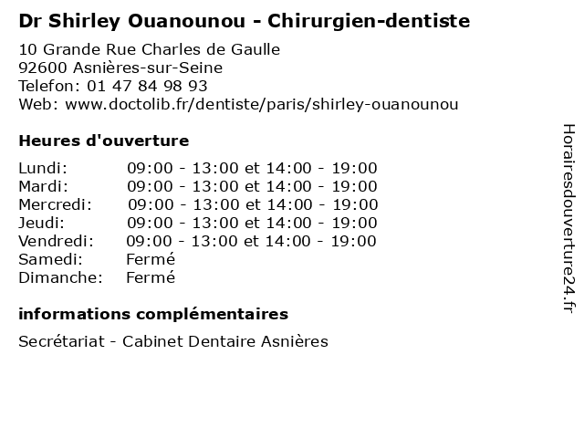 1 Dr Shirley Ouanounou - Chirurgien-dentiste (Distance: 9,14 km) 52-56 Rue de Stalingrad, 95120 Ermont blanchiment, centre, chirurgien, dentaire, dentiste, dents, dr, détartrage, ermont, ouanounou, shirley 2 Dr Shirley Ouanounou - Chirurgien-dentiste (Distance: 16,08 km) 1 Rue Georges Clemenceau, 78000 Versailles chirurgien, dentaire, dentiste, dr, implantologie, ouanounou, parodontologie, shirley 3 Dr Shirley Attal - Chirurgien-dentiste (Distance: 0,00 km) 10 Grande Rue Charles de Gaulle, 92600 Asnières-sur-Seine attal, chirurgien, dent, dentiste, docteur, dr, shirley, soins 4 Maître Shirley Hennequin - Avocate (Distance: 3,46 km) 17 rue de Chéroy, 75017 Paris avocate, avocats, cabinet, conseils, contentieux, hennequin, juridique, justice, litiges, maître, services, shirley 5 Maître Shirley Magniez-Pouget - Avocate (Distance: 5,14 km) 27 rue Laffitte, 75009 Paris avocate, avocats, cabinet, conseils, contentieux, juridique, justice, litiges, magniez, maître, pouget, services, shirley 6 Shirley Abitbol Beguier - Diététicienne (Distance: 6,61 km) 35 Rue de Turbigo, 75003 Paris abitbol, alimentation, beguier, dieteticien, diététicienne, nourriture, sante, shirley |