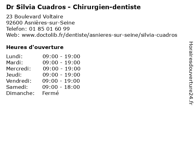 1 Dr Silvia Hernandez - Chirurgien-dentiste - secrétariat (Distance: 3,10 km) 2 Boulevard de la République, 92250 La Garenne-Colombes chirurgien, consultation, dentiste, docteur, dr, hernandez, med, médecin, médecine, secrétariat, silvia, traitement 2 Dr Maria Silvia Munteanu - Médecin du travail (Distance: 3,85 km) 80 rue de Clichy, 75009 Paris consultation, docteur, dr, du, maria, med, munteanu, médecin, silvia, traitement, travail 3 Maître Silvia Lepel - Avocate (Distance: 3,95 km) 222 rue du Faubourg Saint-Honoré, 75008 Paris avocate, avocats, cabinet, conseils, contentieux, juridique, justice, lepel, litiges, maître, services, silvia 4 Maître Silvia Rumanescu - Avocate (Distance: 4,48 km) 26 avenue Kléber, 75116 Paris avocate, avocats, cabinet, conseils, contentieux, juridique, justice, litiges, maître, rumanescu, services, silvia 5 Dr Silvia Romanello - Pédiatre (Distance: 4,84 km) 108 Avenue Victor Hugo, 75116 Paris docteur, dr, generaliste, medical, pédiatre, romanello, silvia, soin 6 Dr Silvia Giurgiu - Chirurgien-dentiste (Distance: 6,44 km) 6 Rue Albert Camus, 75010 Paris chirurgien, dentiste, dr, giurgiu, médecin, médecine, médical, pharmaceutique, silvia, traitement |
