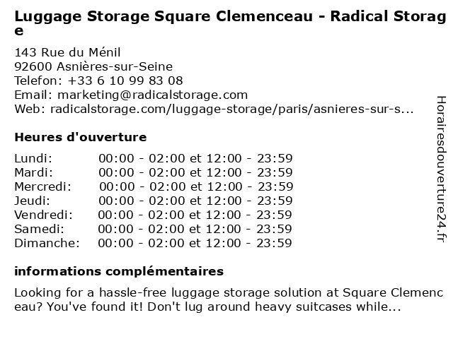 1 Luggage Storage Asnières-sur-seine - Radical Storage (Distance: 0,33 km) 94 Rue Victor Hugo, 92600 Asnières-sur-Seine asnières, luggage, luggage storage, luggage storage near me, radical, seine, storage, sur 2 Nannybag Luggage Storage (Distance: 0,69 km) 14 Place Jean Mermoz, 92270 Bois-Colombes luggage, nannybag, storage 3 Nannybag Luggage Storage (Distance: 0,99 km) 108 Avenue Gabriel-péri, 92230 Gennevilliers luggage, nannybag, storage 4 Square Pompidou Horaires d'hiver (Distance: 1,03 km) - Avenue du Docteur Fleming, 92600 Asnières-sur-Seine arbre, d'hiver, espace vert, forêt, horaires, loisirs, nature, parc, pompidou, prairie, square 5 Square Pompidou Horaires d'été (Distance: 1,03 km) - Avenue du Docteur Fleming, 92600 Asnières-sur-Seine arbre, d'été, espace vert, forêt, horaires, loisirs, nature, parc, pompidou, prairie, square 6 Nannybag Luggage Storage (Distance: 1,84 km) 6 Rue Gallieni, 92600 Asnières-Sur-Seine luggage, nannybag, storage |